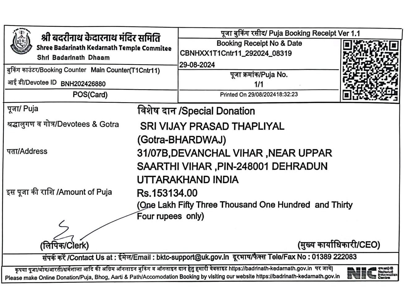 मुख्य कार्याधिकारी विजय प्रसाद थपलियाल ने बताया कि वह श्री बदरीनाथ -केदारनाथ मंदिर समिति में सेवा  के लिए आये है उन्होंने  29 जुलाई 2024 को मंदिर  समिति में पदभार ग्रहण किया था आज 29 अगस्त को एक महीने की सेवा पूरी होने पर गुरुवार एकादशी के शुभ दिवस पर उन्होंने अपनी आस्था -विश्वास से एक माह की वेतन की धनराशि भगवान बदरीविशाल तथा भगवान केदारनाथ के चरणों में भेंट की है।
